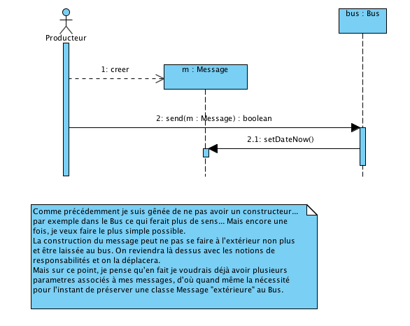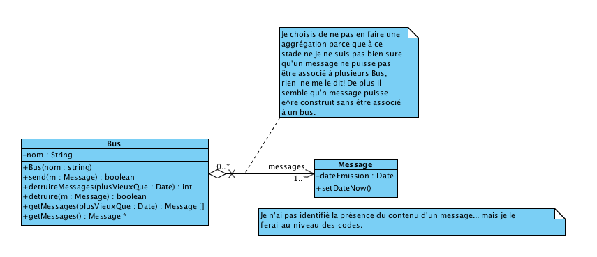 package busPk; import java.util.ArrayList; public class MonScenario { /** * @param args */ public static void main(String[] args) { //créer un bus de nom "Nice-Circulation" Bus monBus = new Bus("Nice-Circulation"); //créer un message annonçant "une attente de 5mn" Message m1 = new Message("Attente de 5mn"); //publier le message sur le bus, monBus.send(m1); //créer un message annonçant "un accident" Message m2 = new Message("Accident"); //publier le message sur le bus, monBus.send(m2); //lire les messages, ArrayList<Message> messages = monBus.getMessages(); // afficher le contenu des message. for (Message m : messages ) System.out.println("Message : " + m.getContent() ) ; } }