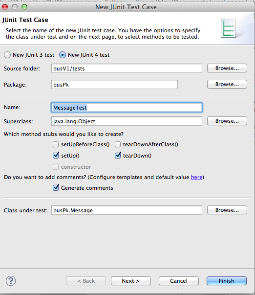 Dans le menu contextuel de, par exemple la classe Message, cliquez sur New – Others - Java - JUnit Test Case1). Dans le panneau qui s'affiche