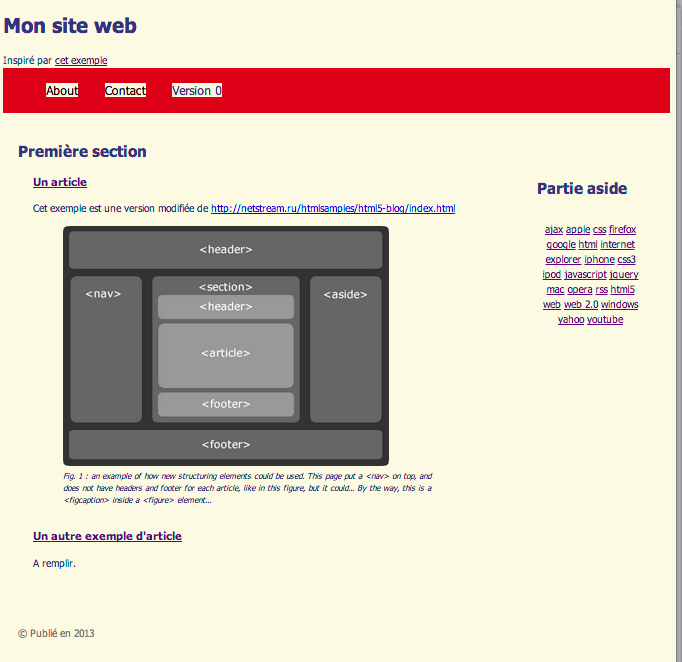 Nous nous proposons à présent de structurer votre propre page web en utilisant ces balises. Pour cela vous vous aiderez de l'exemple suivant et des informations données dans les rubriques ci après.