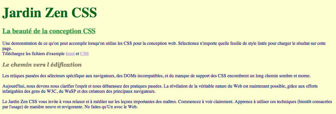<head> <title>Jardin Zen CSS</title> </head> <body bgcolor="#FFFFCC" text="#000099" link="#663399" vlink="#993333" alink="#FF9933"> <h1><font face="French Script MT" size="7" color="#006600">Jardin Zen CSS</font></h1> <h2><font size="5" color="#669933"><b><u>La beauté de la conception CSS</u></b></font></h2> Une demonstration de ce qu'on peut accomplir lorsqu'on utilise les CSS pour la conception web. Sélectionez n'importe quelle feuille de style listée pour charger le résultat sur cette page. <br> Téléchargez les fichiers d'exemple <a href="xxx.html" title="Clique-droit pour sauver ce document sur votre disque dur." style="color: #B7A5DF"><b>html</b></a> et <a href="xxx.css" title="Clique-droit pour sauver ce document sur votre disque dur." style="color: #B7A5DF"><b>CSS</b></a> <h3><i><font face="Georgia" color="#7d775c">Le chemin vers l édification</font></i></h3> Les reliques passées des sélecteurs spécifique aux navigateurs, des DOMs incompatibles, et du manque de support des CSS encombrent un long chemin sombre et morne. <br><br> Aujourd'hui, nous devons nous clarifier l'esprit et nous débarassez des pratiques passées. La révélation de la véritable nature du Web est maintenant possible, grâce aux efforts infatigables des gens du W3C, du WaSP et des créateurs des principaux navigateurs. <br><br> Le Jardin Zen CSS vous invite à vous relaxer et à méditer sur les leçons importantes des maîtres. Commencez à voir clairement. Apprenez à utiliser ces techniques (bientôt consacrées par l'usage) de manière neuve et revigorante. Ne faites qu'Un avec le Web. <br></body>