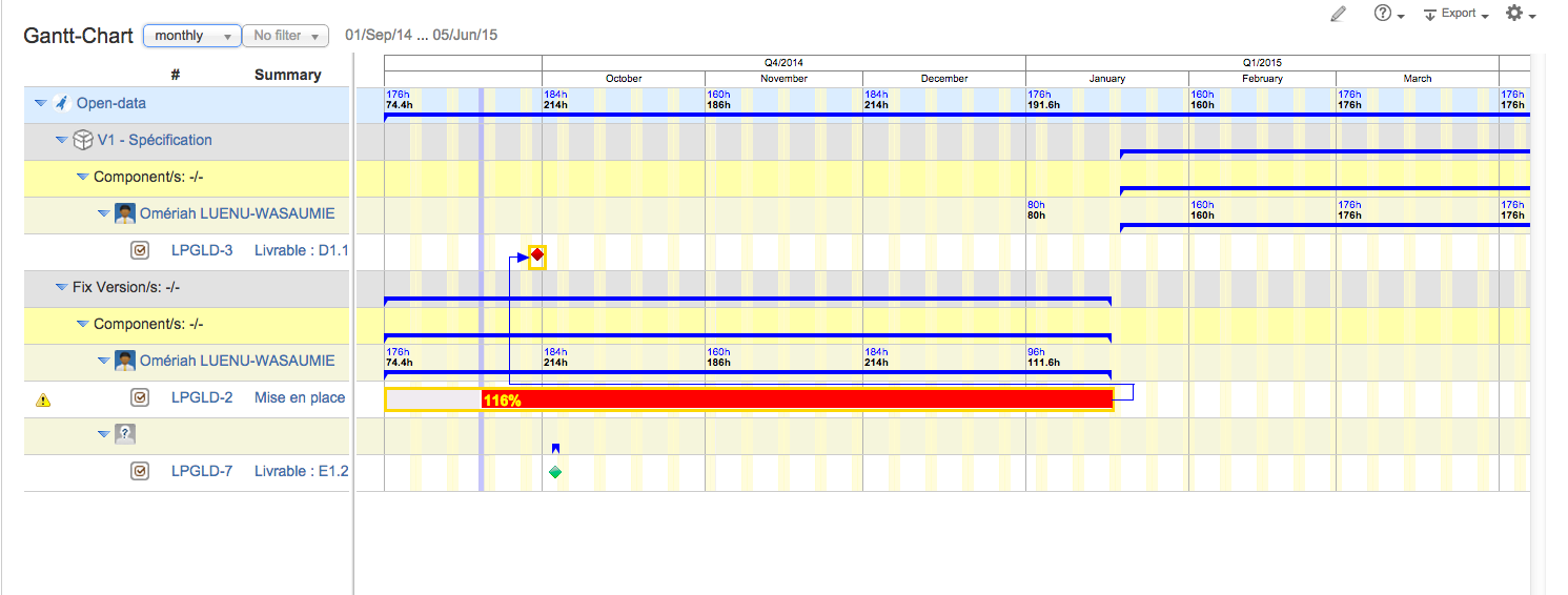 - Placez-vous sur le projet et vous pouvez à présent visualiser votre projet sous la forme d'un diagramme de Gannt (Gantt-Chart à Gauche).