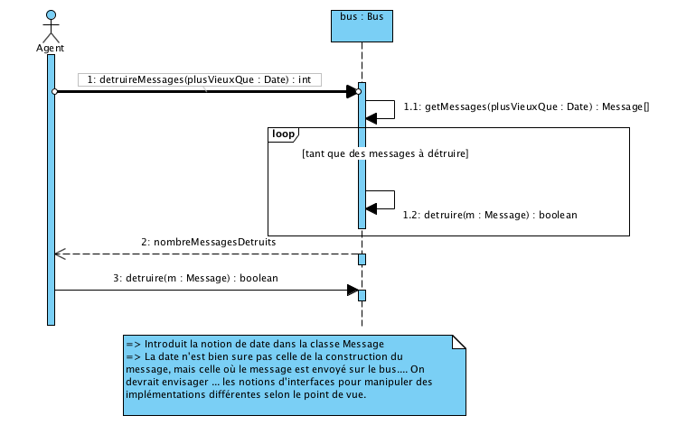 package busPk; import java.util.ArrayList; public class MonScenario { /** * @param args */ public static void main(String[] args) { //créer un bus de nom "Nice-Circulation" Bus monBus = new Bus("Nice-Circulation"); //créer un message annonçant "une attente de 5mn" Message m1 = new Message("Attente de 5mn"); //publier le message sur le bus, monBus.send(m1); //créer un message annonçant "un accident" Message m2 = new Message("Accident"); //publier le message sur le bus, monBus.send(m2); //lire les messages, ArrayList<Message> messages = monBus.getMessages(); // afficher le contenu des message. for (Message m : messages ) System.out.println("Message : " + m.getContent() ) ; } }