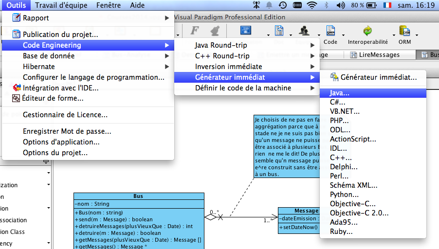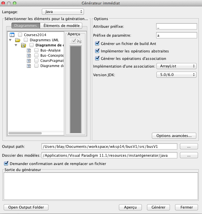 Les codes doivent être généré directement à partir de Visual Paradigm. En considérant que vous avez créé un projet eclipse pour accueillir ces codes, voici la marche à suivre :