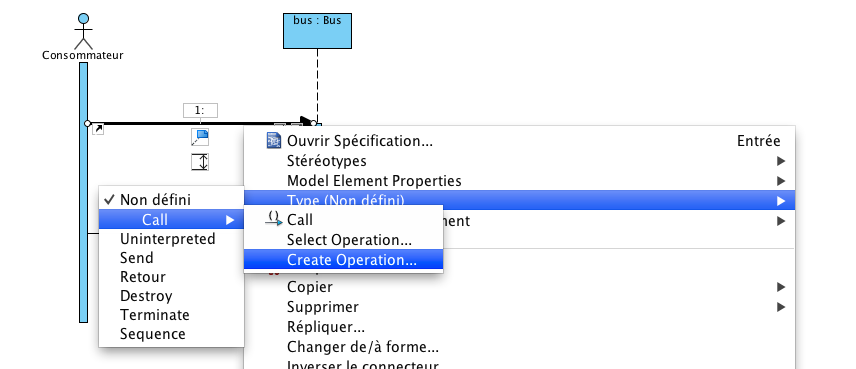 - Définissez, par cas d'utilisation, un diagramme de séquence élémentaire mettant en jeu les objets de votre système et compléter votre diagramme de classes au fur et à mesure. Pour cela utilisez, évidemment des lignes de vie qui font référence à des classes et les messages “Call” qui vous permettent d'identifier les méthodes d'appels et mettent automatiquement à jour vos diagrammes de classes