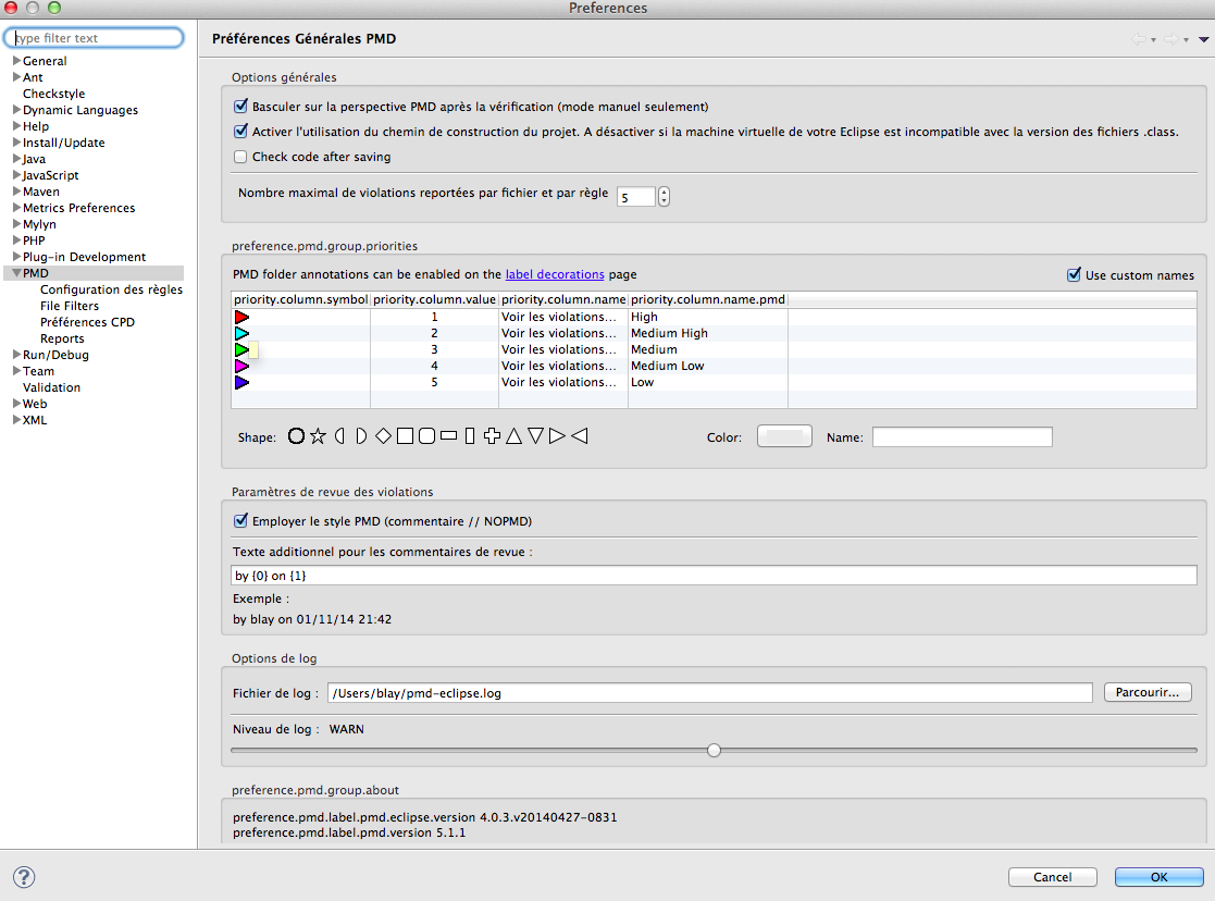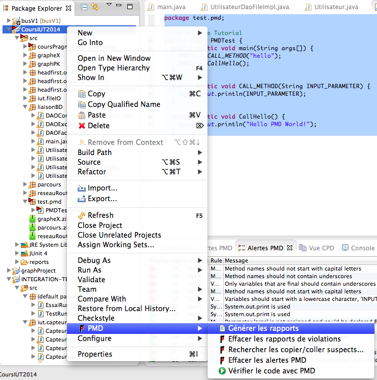 - Sélectionner le projet → propriétés → PMD → activer PMD