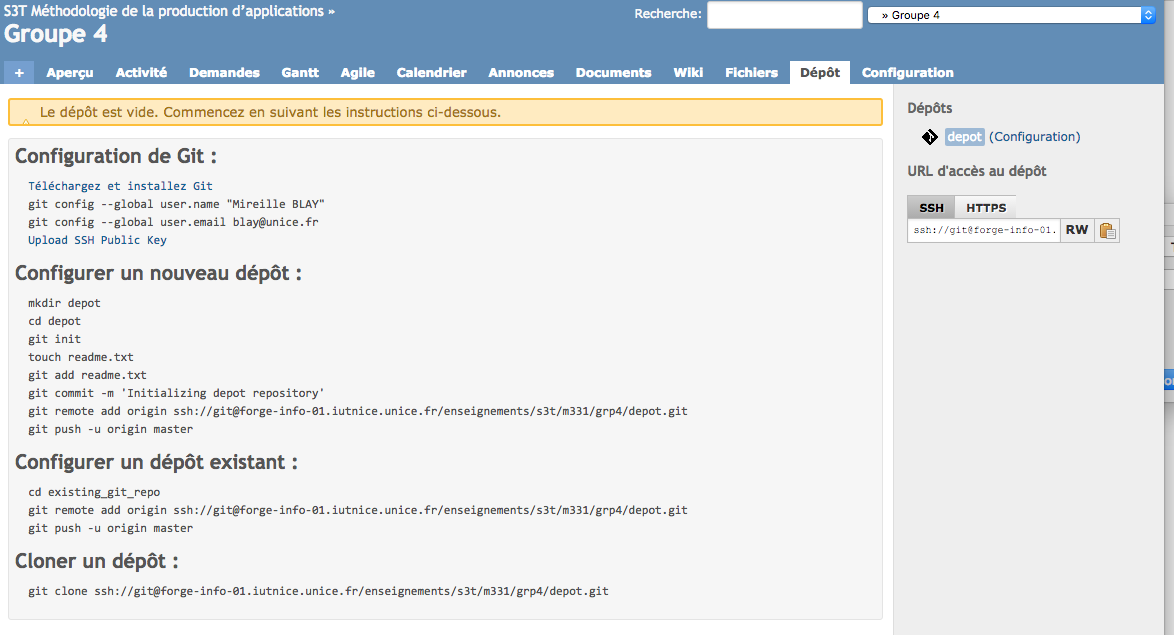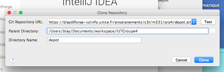 Tous les étudiants à la fin du TD ont un projet MAVEN dans leur propre environnement connecté par GIT à la forge. Le chef de projet fait le travail à la racine pour vérifier que le dépôt GIT principal qui sera utilisé en intégration fonctionne bien. Vous pourrez y placer les codes que vous voudrez partager dans l'ensemble du groupe. Puis pour s'assurer qu'il sait collaborer, il récupère les codes d'un quelconque de ses sous-projets.