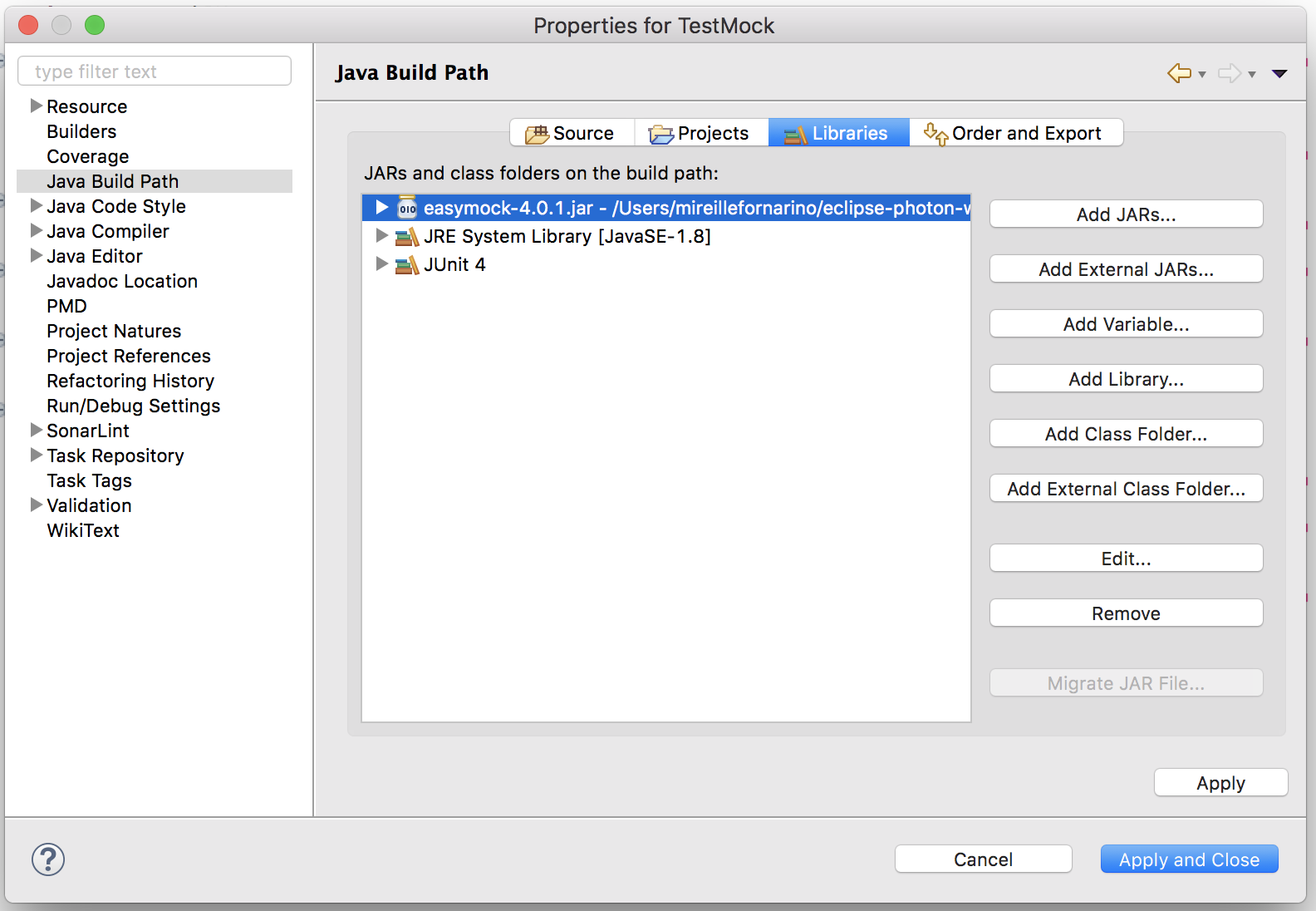 - Suivez le “getting started” de easyMock Mais au lieu d'utiliser maven utilisez directement le fichier jar ci-joint 1). Pour cela, sur le nom du projet > Properties > Java Build Path > Puis ajouter le .jar ci dessus.